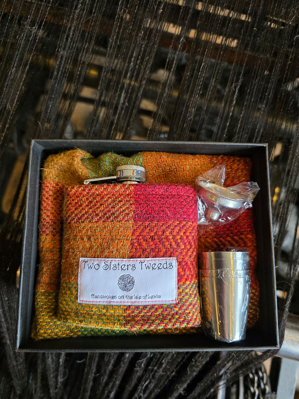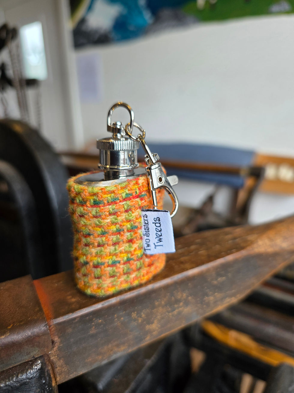 Covered in our handwoven Two Sisters Tweed or Harris Tweed these stainless steel hipflasks are perfect for a wee dram!